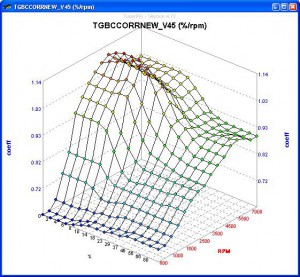 pcorr2 на высоких нагрузках и ХХ имеет значение=1. На высоких оборотах и низких нагрузках =0. Кроме того чтоб не перегружать алгоритм расчета топливоподачи на высоких оборотах (5100) механизмы коррекции попросту отключаются. Теперь осталось выстроить таблицу pcorr2 таким образом, чтоб в зоне ХХ по нагрузке gbccorr стремилась к плоскости а по оборотам повторяла форму ВСХ. Для этого как обычно используется ПАК «Матрица» и программа трехмерного редактирования поверхностей Tunerpro.. Вот, что получилось в результате: